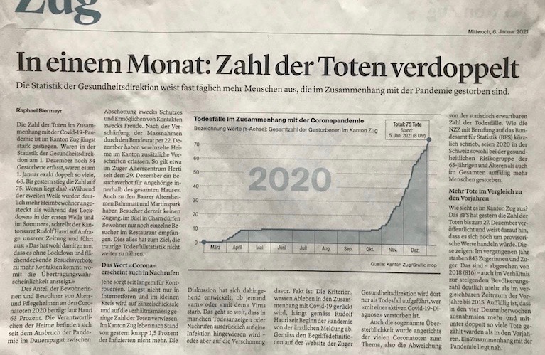 In der Zuger Zeitung 6.1.21 ist grafisch dargestellt, wie Cov. Todeszahlen in unserem Kanton ab Oktober angestiegen sind. Von April bis Oktober waren 10 Menschen pro Monat gestorben. Dies zeigt eine Korrelation zum ausbleibenden Vit. D3 von der Sonne mit ausbleibender UV-B Strahlung ab Oktober. Die Sonnenstrahlen unter 45° werden an der Stratosphäre komplett reflektiert.