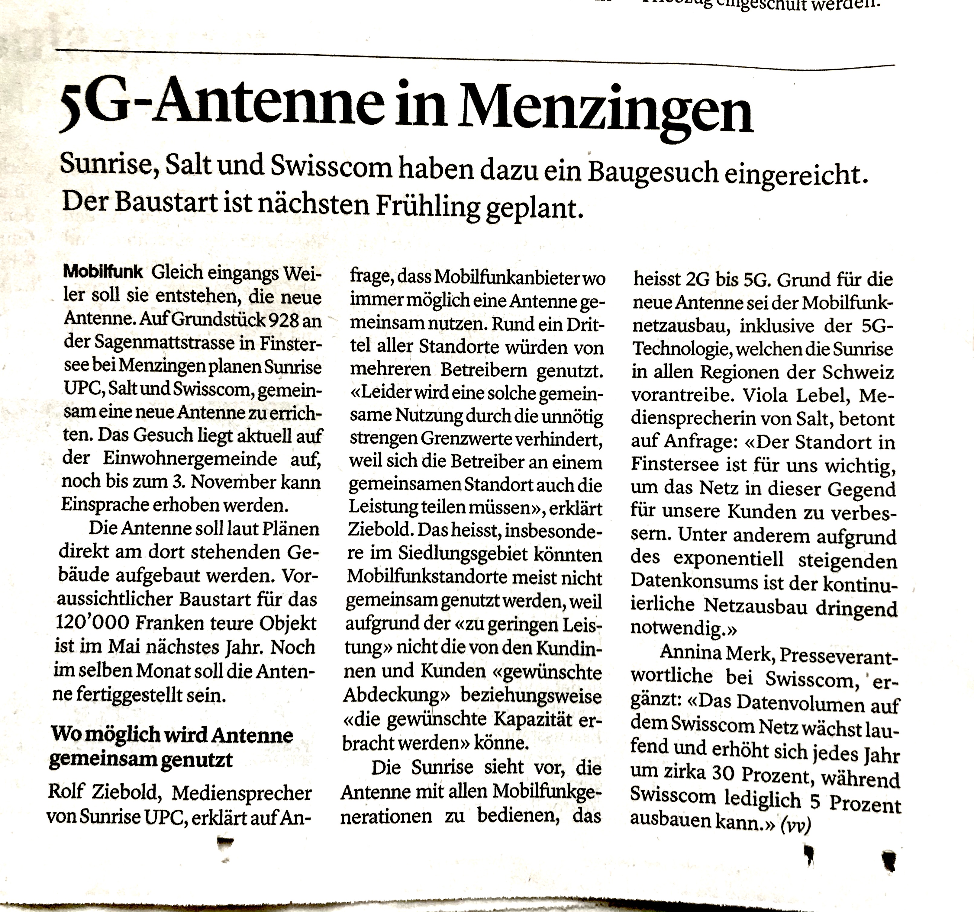 Der Entscheid des Gemeinderates ist für Laien nur schwer verständlich, auch nicht für ihn selber. Nach über zwei Jahren und vielen Dokumenten zwischen Bauabteilung Menzingen und den Antennenanbietern musste der Gemeinderat die Antenne bewilligen. Es ist mir noch nicht ganz klar, wieso keine echte 5G Antenne, vermutlich ohne Beam Finder, nicht mehr zum Ansatz kommt. Was ist da passiert? Die Bau Abteilung hat sich sehr stark eingesetzt und hatte eine grosse Arbeit geleistet. Sie musste sich Expertenwissen aneignen, was die Gemeinderäte nicht können. Die Gemeinderäte meinen immer noch, die Vorgaben des Bundes erfüllen zu müssen. Der Bund zwingt die Gemeinden immer noch, die wirtschaftlichen Vorgaben des flächendeckenden Überangebots den Gesundheitlichen Auswirkungen voranzubringen stellen, so wie das in den Dokumenten des Bundes (BAFU 23.6.2021) gefordert ist.