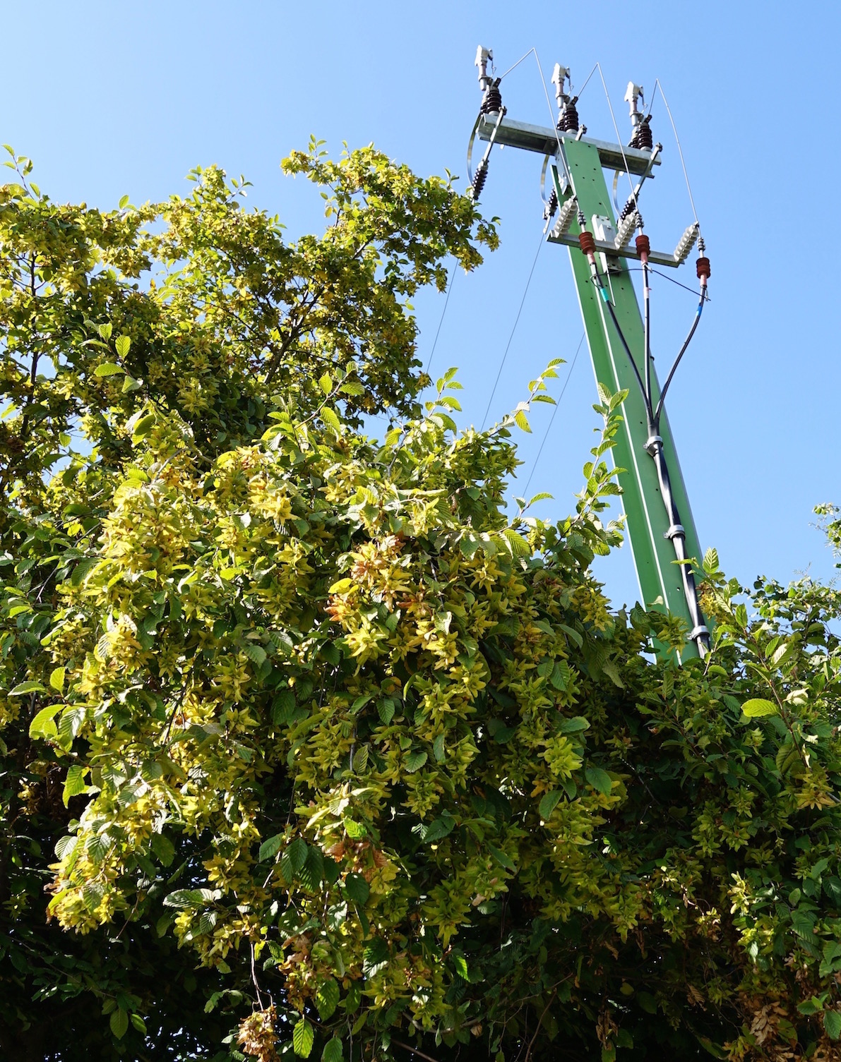 Eine genaue Beobachtung der Blätter in der nahen Umgebung zeigten schwarze Verbrennungen an den Blatträndern. Am 17. Sept. 2019 habe ich mit dem pensionierten Förster Karl Müller eine Begehung der östlichen Umgebung des ESAF Geländes gemacht. Er pflanzte 1961 die Bäume und Sträucher an der neuen Lorze. Er sieht den Bäumen an, ob es ihnen gut geht. Er versuchte immer auch andere Umwelteinflüsse zu berücksichtigen. Trotz heissen zwei Sommern sind viele Verbrennungen nur an aussen liegenden Blättern klar zu erkennen. Innenliegende Blätter wurden nicht geschädigt, weil die aussenliegenden Blätter sie abschirmen. Und vor Allem die dem Festgelände zugewandten Blätter waren sehr stark geschädigt. Weiter weg von der ESAF Arena gegen die obere Lorzenbrücke, waren die Blätter fast nicht verbrannt. Eindeutige EMF Spuren zeigte die Hagebuche nahe der Arena und zusätzlich unter der Hochspannungsleitung. Sie hat schon vor dem ESAF unter der Hochspannungsleitung, eine übermässige Fruchtifikation gemacht, das heisst: nur Früchte und fast keine Blätter.