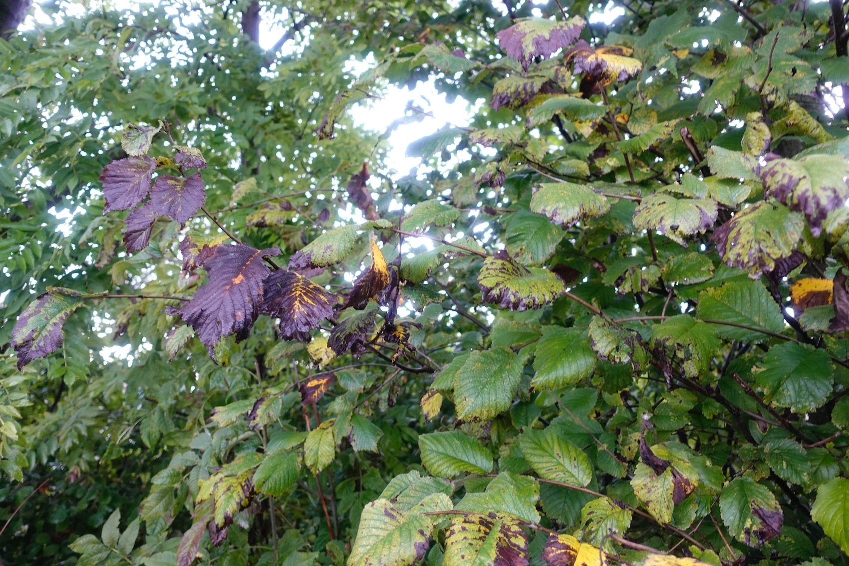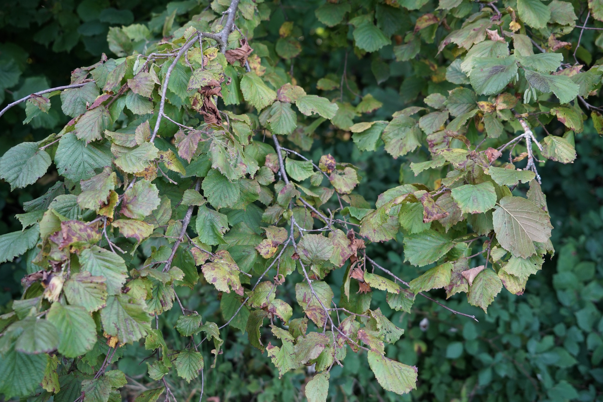 Haselnuss nahe Arena. Äussere Blätter stark verbrannt, weiter innenliegende Blätten blieben grün. Es kann nicht nur die Sonneneinwirkung sein. Der Schaden ist zu stark, nur aussen.