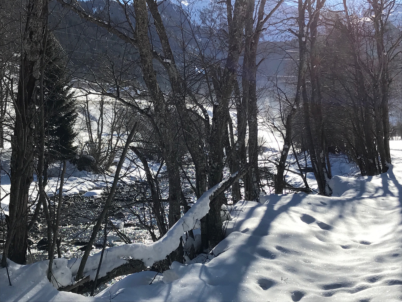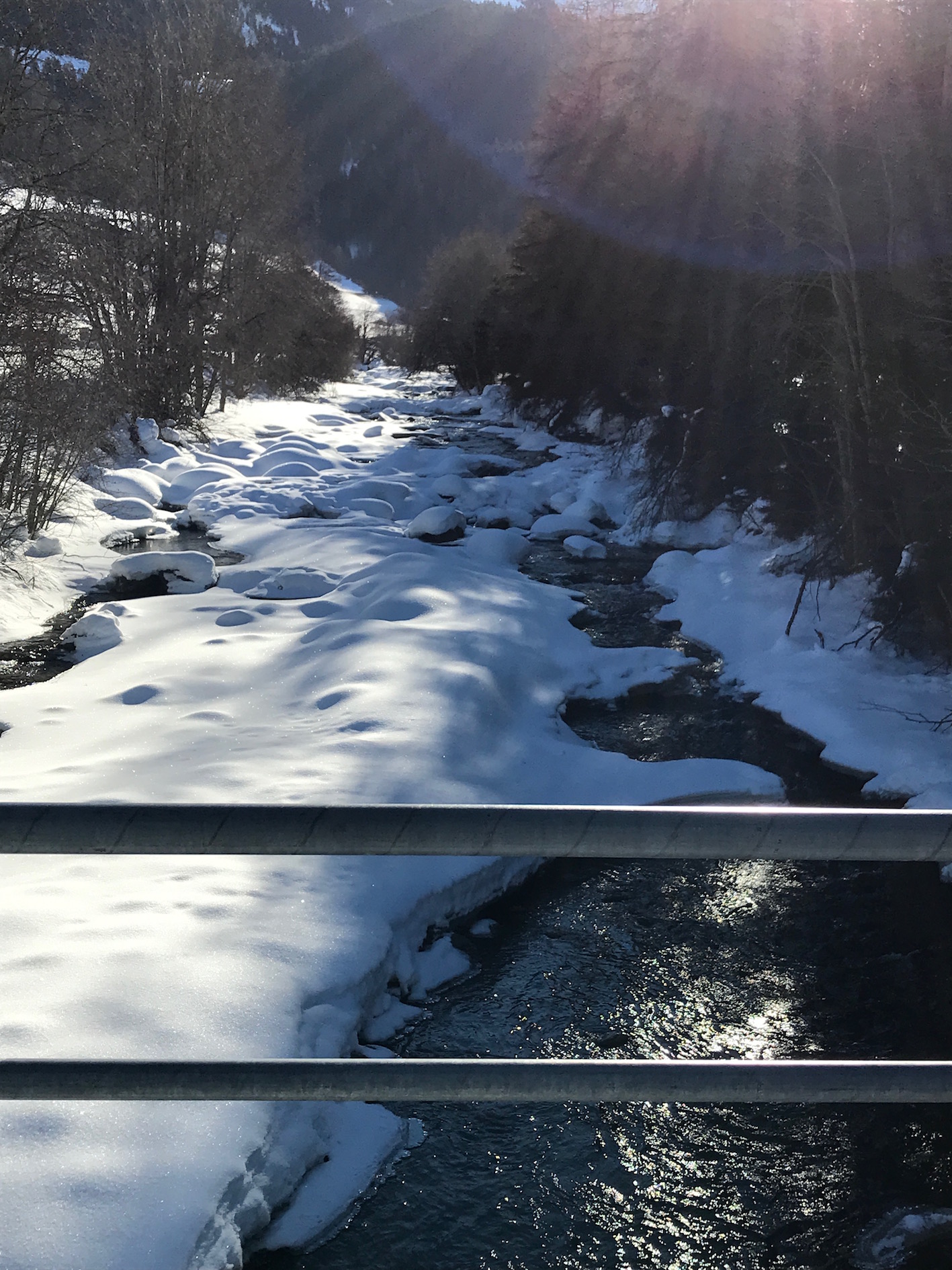 dann geht’s zum Fluss Julia runter, Richtung Kraftwerk – Eiskristalle glitzern im Morgenlicht