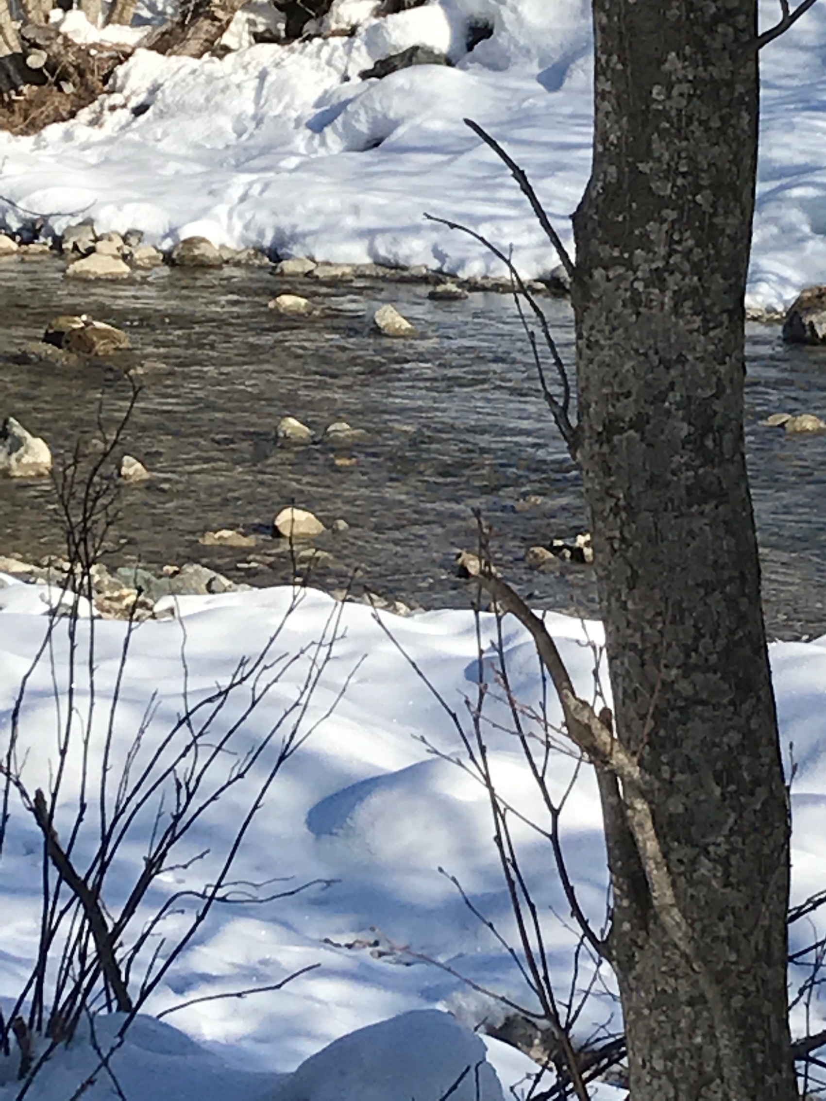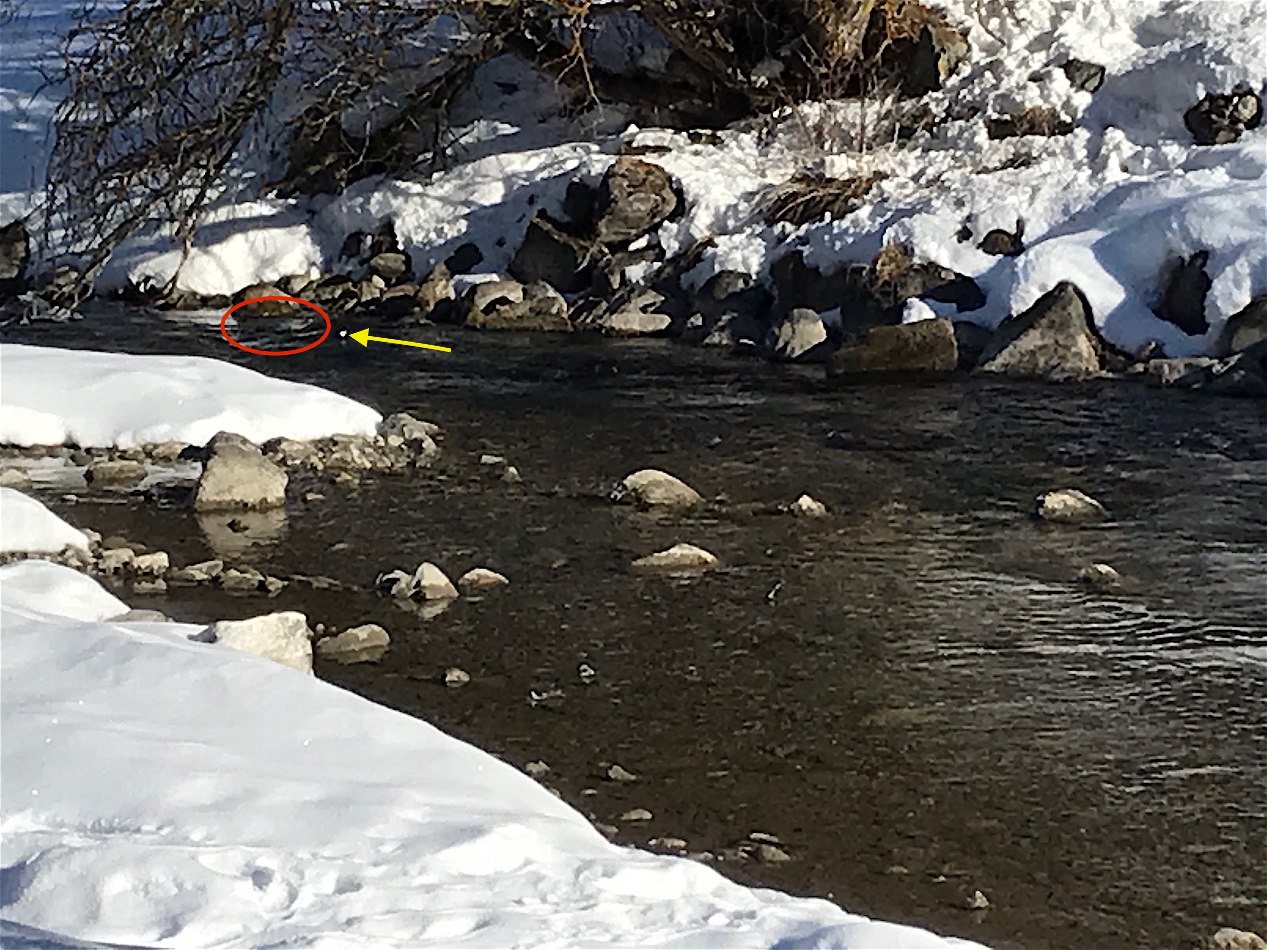 Ein ganz natürlicher Flusslauf. Wasseramseln tauchen sehr flink nach kleinen Fischen und Köcherfliegen etc. Ein Kunststück mit der Handykamera den schnellen Vogel einzufangen. Der gelbe Pfeil zeigt auf die weisse Brust des Vogels, es ist kein Schneefleck! Und im folgenden Film markiert das rote Oval die Tauchstellen. Sie taucht zweimal von rechts nach links. Durch die Bewegung kann der Vogel besser gesehen werden als auf der Foto. Eventuell nur sichtbar auf grossem Bildschirm am Computer oder auf Tablet.