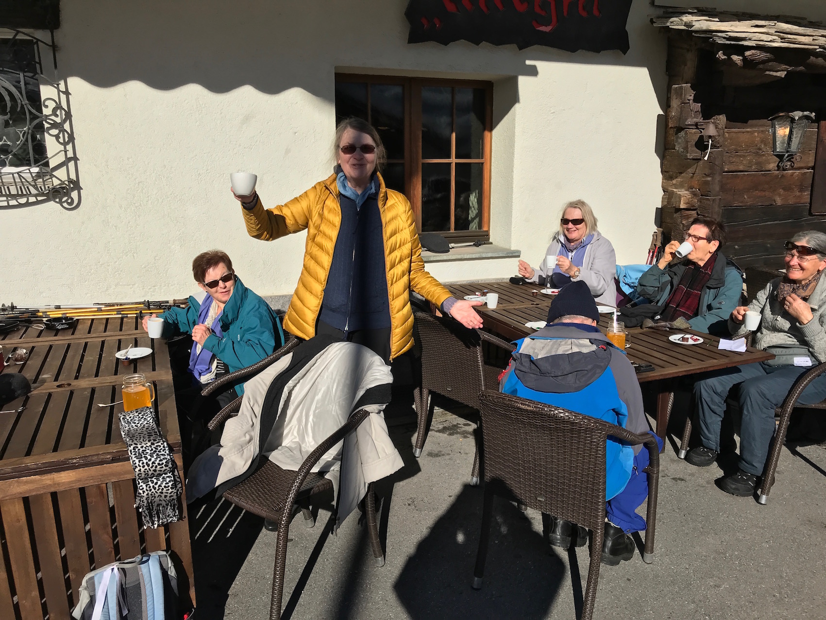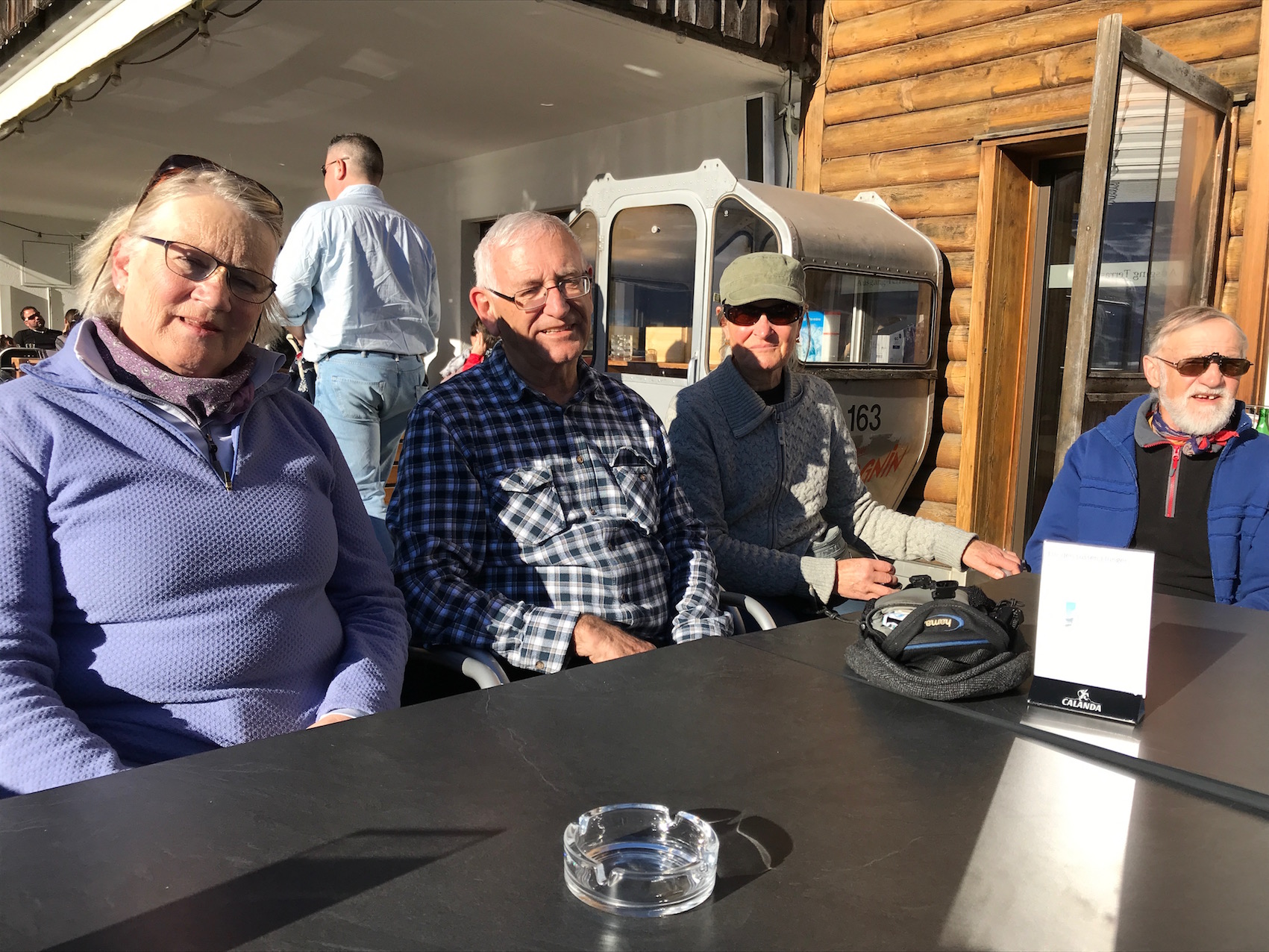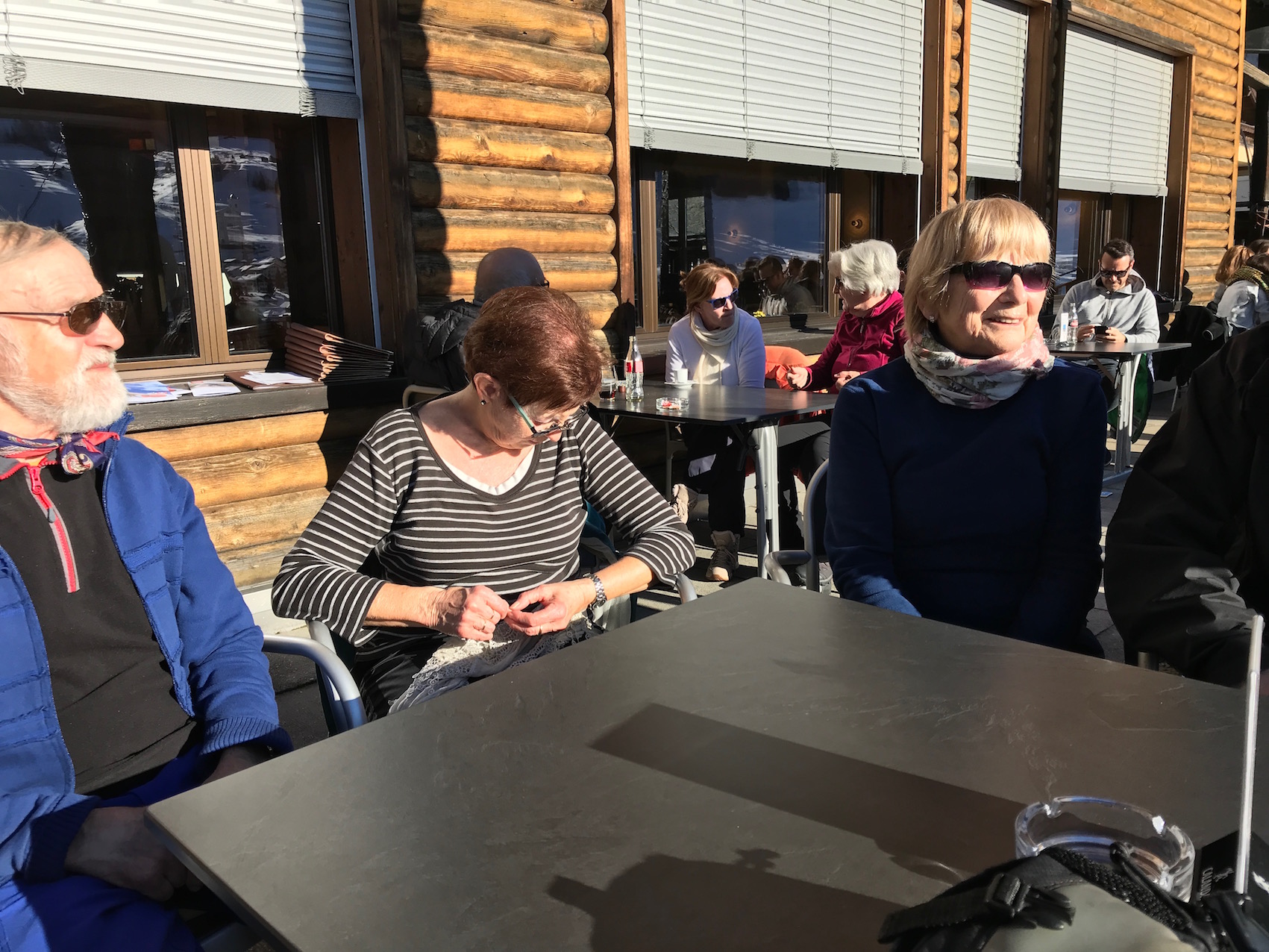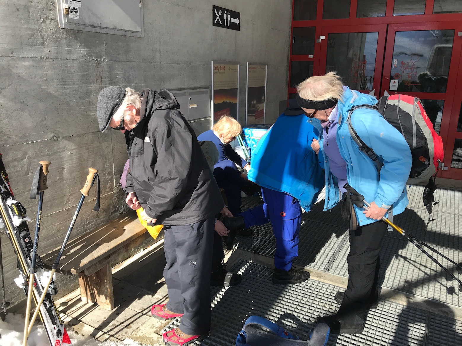 nach dem Essen werden die sicheren Schneekrallen für den 2 stündigen Abstieg bequem auf den Bänklein sitzend montiert