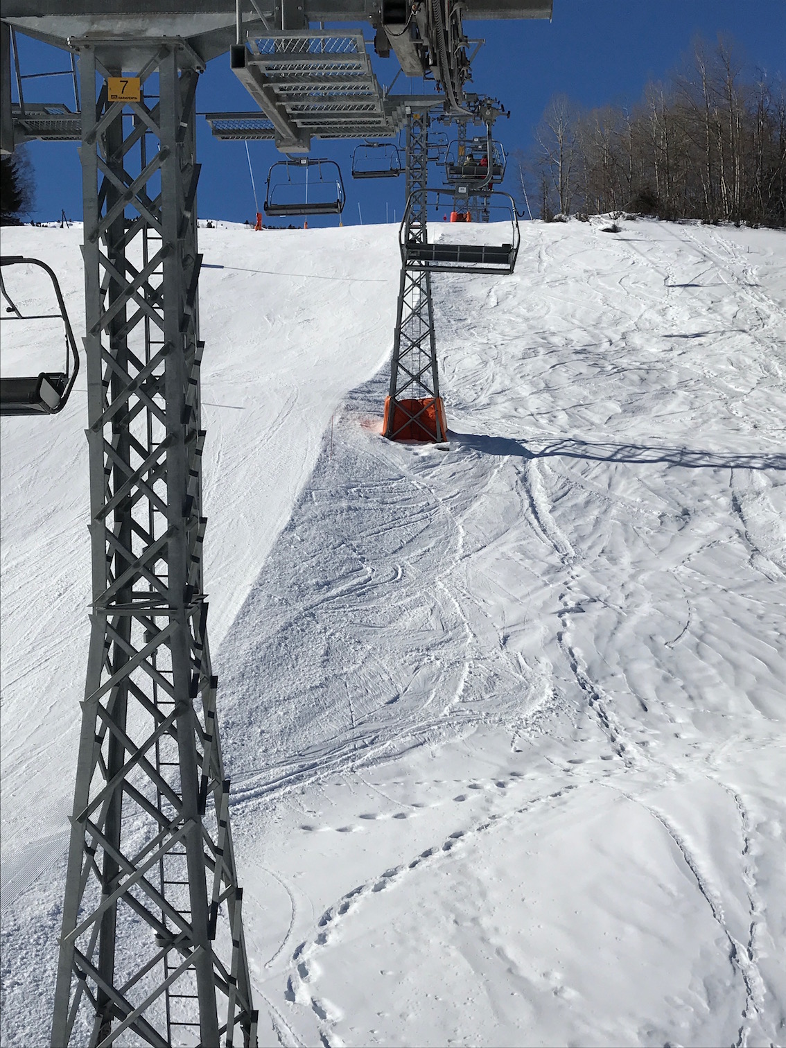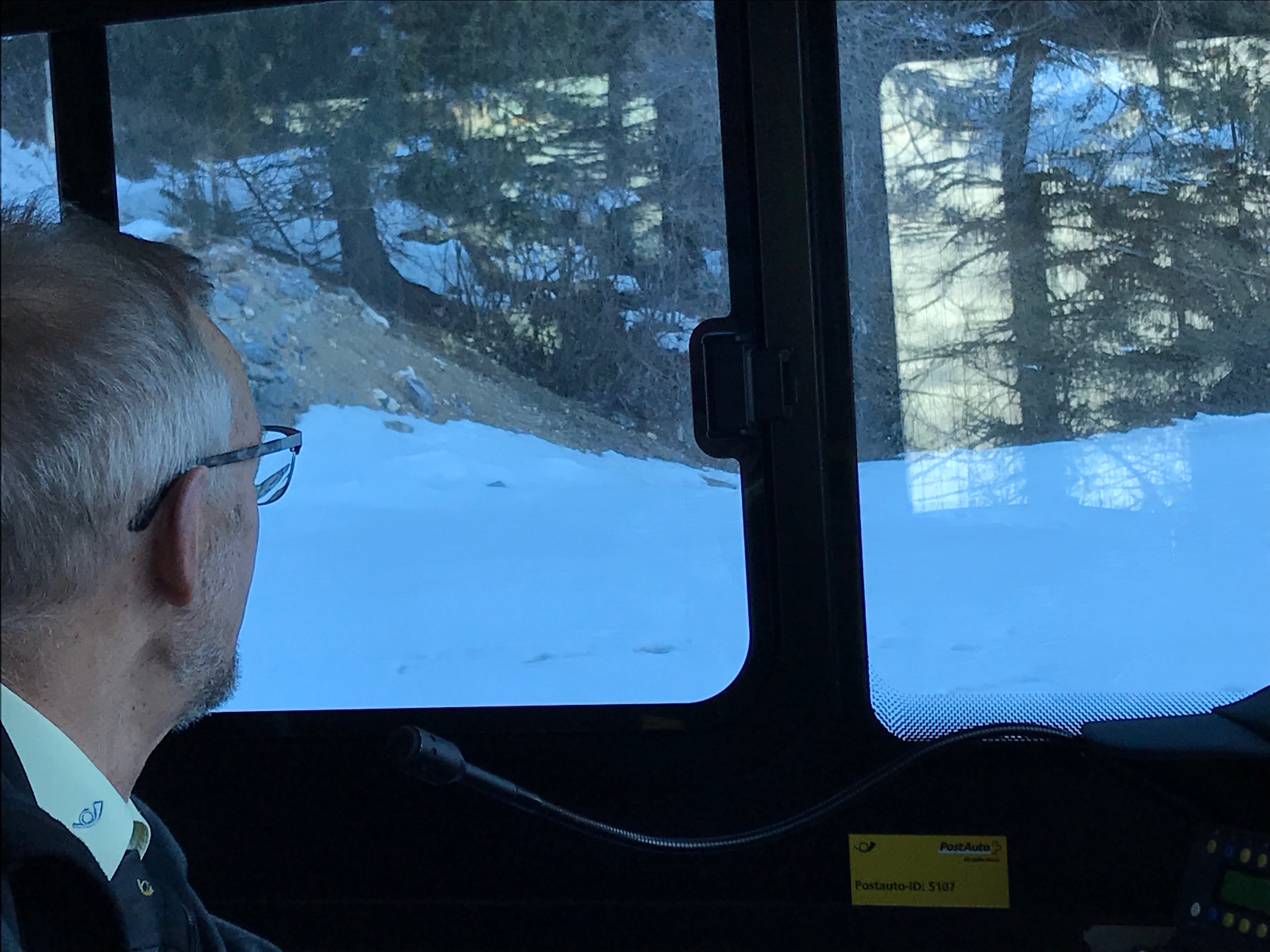 Unser Buschauffeur erklärt, dass Abends die Hirsche hier stehen. Sie bewegen sich kaum und werden heutzutage nicht mehr gefüttert. Mit kargem selber gefundenem Futter reduziert sich ihr Stoffwechsel und sie kommen besser durch den Winter. Bei der Retourfahrt sahen wir tatsächlich an diesen Stellen Hirsche im tiefen Schnee am Waldrand stehen.