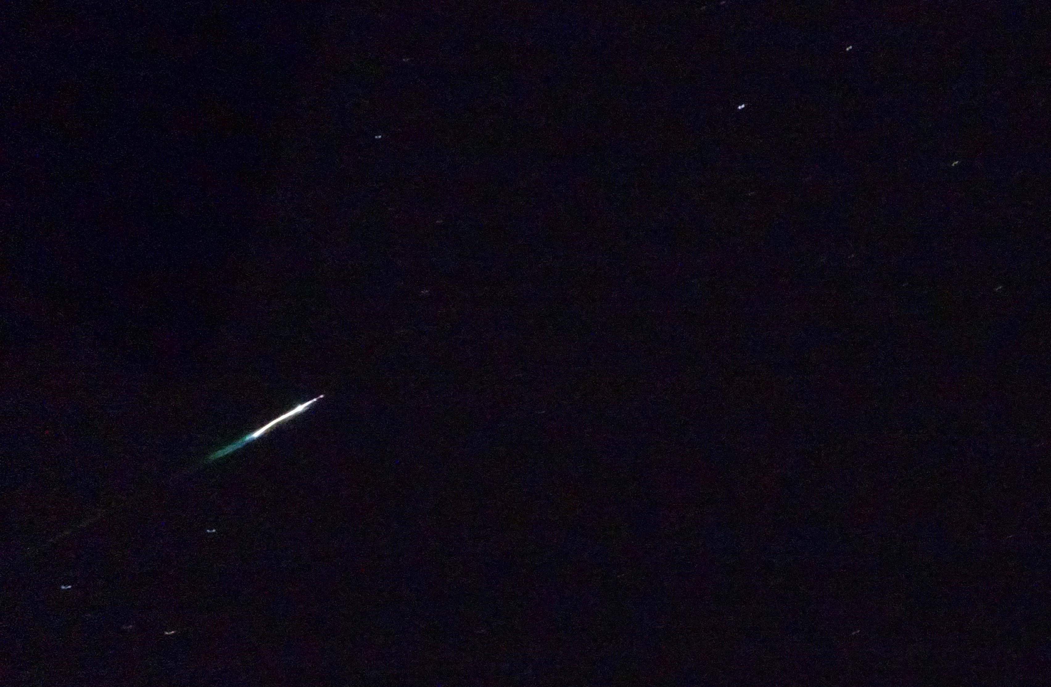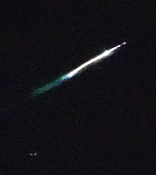Zuerst flitzen 4 Sternschnuppen über den Himmel dass ich keine Chance hatte eine zu fotografieren. Ich hatte die kleine Sony Kamera DSC-HX90V zur Hand stellte den Drehknopf auf A (fixe Blende) und legte mich auf den Liegestuhl in unserem Garten in den Ammannsmatt auf die Lauer. Also Auf der Maur auf der Lauer ;-)) Mit einem leichten andrücken des Auslösers war ich bereit für einen schnellen Schnappschuss. Die Distanzmessung leuchtete etwa 2s rot auf und löschte dann wieder. Jetzt war die Kamera bereit, dass ich bei einem stärkeren Drücken des Auslöseknopfes sofort ein Foto schiessen konnte. Die Automatiche Blende war dann 3.2s offen. Das hörte ich mit einem leisen Klicken. Ich übte das ein paarmal und sah dass die Sterne ganz passabel fotografiert werden konnten und dass ich die Kamera auf dem Bauch haltend recht gute und nicht verwackelte Bilder machen konnte. Die Uhr kam langsam gegen Mitternacht und da erstrahlte langsam eine grosse Kugel am Himmel die gefühlsmässig über mir stehen blieb. Ich drückte den Auslöser und war völlig überrascht ob der grossen Leuchtkraft die da oben auf mich zuflog. Ich hatte das Gefühl, es dauerte fast eine Sekunde. Ich war überwältigt vom Aufleuchten am Himmel. Die vorherigen 4 Sternschnuppen waren nichts gegen die Leuchtkraft meines 5. Sternschnuppens. Aber mehr habe ich gestaunt also ich mit der ersten Vergrösserung direkt mit der Kamera einen unglaublich leuchtenden grün-blauen Schweif sah. Die zwei hellen Punkte an der Spitze entstanden wohl wegen der Kameraführung mit der Hand auf meinem Bauch. Die anderen Sterne sind ja wegen der Bewegung als doppelte Punkte sichtbar. Ein ganz schwaches Nachleuchten sieht man über eine zweienihalbfache Länge der Leuchtspur. Weil die eigentliche Leuchtspur nur relativ kurz sichtbar war, flog der Sternschnuppen direkt auf mich zu. Wenn er 100% auf mich zugeflogen wäre, dann gäbe es nur einen Punkt auf der Foto auch bei starker Vergrösserung. So ist er eben nur fast auf mich zugeflogen.