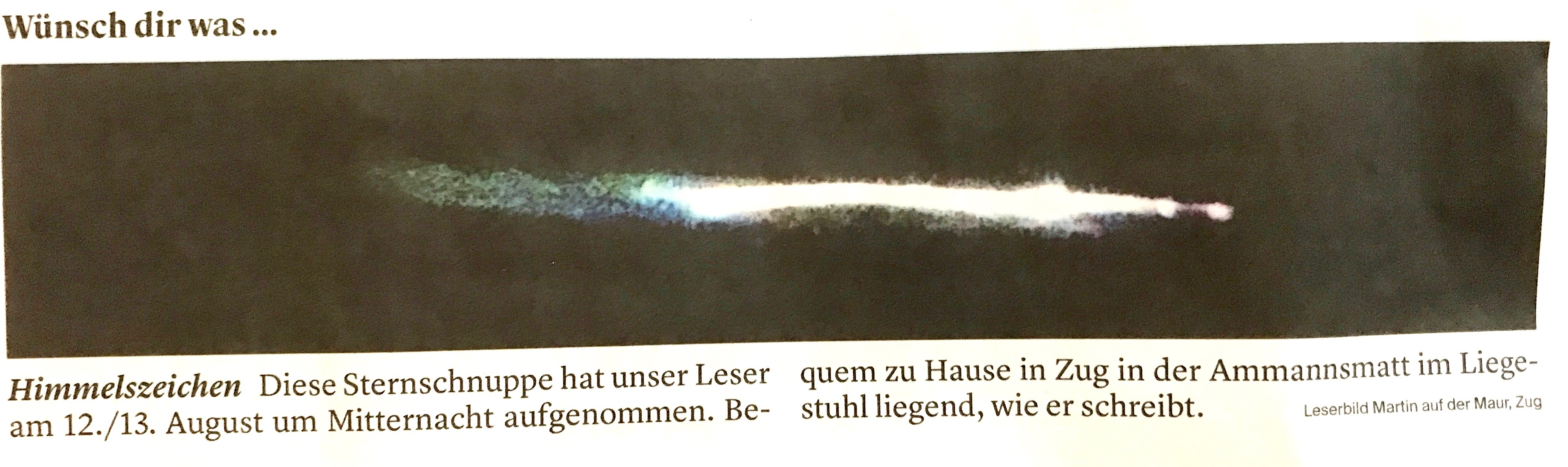 Noch mehr erstaunt war ich, als in der Dienstag Ausgabe vom 13. 8.2018 der Zuger Zeitung mein Sternschnuppen Schnappschuss mit trefflichem Kommentar veröffentlich wurde.